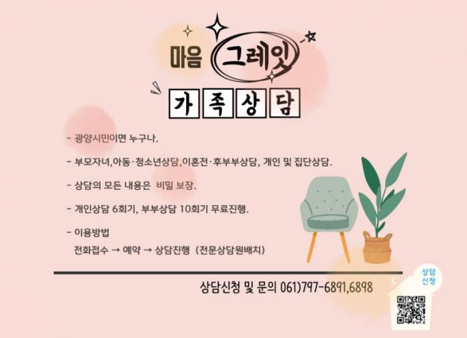 ±¤¾ç½Ã °¡Á·¼¾ÅÍ °¡Á·»ó´ã »ç¾÷Àº ¾ÕÀ¸·Îµµ 1ÀÎ °¡±¸, ½ÅÈ¥±â ºÎºÎ, »çÃá±â Àڳฦ µÐ ºÎ¸ð µîÀ» À§ÇÑ ´Ù¾çÇÑ Áý´Ü»ó´ãÀ» ÁøÇàÇÒ ¿¹Á¤À̸ç, °³ÀÎÀ̳ª °¡Á· »ó´ãÀ» »ó½Ã ¿î¿µÇÑ´Ù.