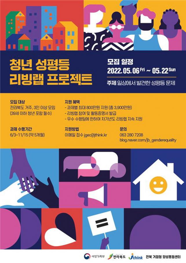 Àϻ󿡼 ¹ß°ßÇÑ ¼ºÆòµî ¹®Á¦¸¦ ÁÖÁ¦·Î Àü¶óºÏµµ¿¡ °ÅÁÖÇÏ´Â 3ÀÎ ÀÌ»ó ¸ðÀÓ (39¼¼ ÀÌÇÏ Ã»³â Æ÷ÇÔ Çʼö)À» ´ë»óÀ¸·Î ÇÏ´Â À̹ø ¸®ºù·¦ »ç¾÷Àº 6¿ù~11¿ù±îÁö ¾à 5°³¿ù °£ Ȱµ¿ÇÑ´Ù. ÀÚ¼¼ÇÑ »çÇ×Àº ÀüºÏ °ÅÁ¡Çü ¾ç¼ºÆòµî¼¾ÅÍ ºí·Î±×(blog.naver.com/jb_genderequality) ¿Í ÀüºÏ¿¬±¸¿ø ¹× ÀüºÏ¿¬±¸¿ø ¿©¼ºÁ¤Ã¥¿¬±¸¼Ò ȨÆäÀÌÁö °øÁö»çÇ׿¡¼ È®ÀÎÇÒ ¼ö ÀÖ´Ù. Áö¿ø ¹æ½ÄÀº jgec@jthink.kr ·Î À̸ÞÀÏ Á¢¼ö¸¦ ¹Þ´Â´Ù.