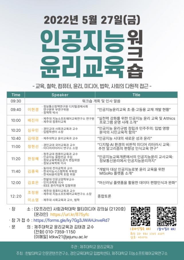 ¿öÅ©¼ó¿¡¼± ¡®ÀΰøÁö´ÉÀ±¸®±³À° ÃÊ‧Áß‧°íµî¿ë ±³Àç °³¹ßÇöȲ¡¯(ÀÌÇö°æ ¹Ú»ç, Á¤º¸Åë½Å Á¤Ã¥¿¬±¸¿ø), ¡®½Çõ·Â °È¸¦ À§ÇÑ ÀΰøÁö´É À±¸®±³À° ¹× A!thics ÇÁ·Î±×·¥ ¿î¿µ»ç·Ê ¼Ò°³¡¯(¹èÁø¾Æ, Á¦ÁÖ´ë Áö´É¼ÒÇÁÆ®¿þ¾î ±³À°¿¬±¸¼Ò ¿¬±¸¿ø), ¡®ÀΰøÁö´É À±¸®±Ô¹ü Á¤¸³°ú ¹ÎÁÖÁÖÀÇ : ÀÔ¹ý ¿µÇ⠺м®ÀÇ ½Ã¹Î±³À°Àû ÇÔÀÇ¡¯(½É¿ì¹Î °æÀα³´ë±³¼ö)¿¡ ´ëÇÑ ÁÖÁ¦ ¹ßÇ¥°¡ ÁøÇàµÈ´Ù.
