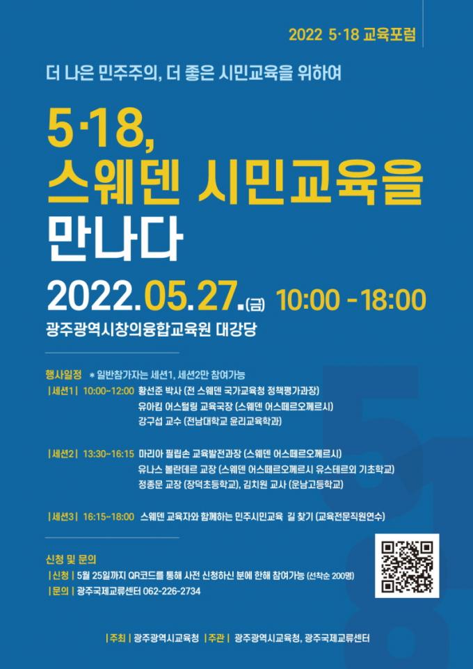24ÀÏ ½Ã±³À°Ã»¿¡ µû¸£¸é À̹ø ¡®2022 5‧18±³À°Æ÷·³¡¯Àº ´ëÇ¥ÀûÀÎ Ç®»Ñ¸® ¹ÎÁÖÁÖÀÇ ±¹°¡ÀÎ ½º¿þµ§ÀÇ ±³À° Àü¹®°¡¿Í ±³ÀåÀ» ÃÊÃ»ÇØ Àü¸é ´ë¸éÀ¸·Î ÁøÇàÇÑ´Ù. Ȳ¼±ÁØ Àü ½º¿þµ§ ±¹°¡±³À°Ã» Á¤Ã¥Æò°¡°úÀåÀ» ºñ·ÔÇÑ ½º¿þµ§ ¾î½º¶¼¸£¿À²²¸£½Ã(Österåkers kommun) ±³À°±¹Àå°ú ±³À°¹ßÀü °úÀå, ±×¸®°í ±âÃÊÇб³ÀåÀÌ Âü¿©ÇØ Çб³ ³» ¹ÎÁÖÁÖÀÇ ±³À° ¹æ¹ý°ú Á¤Ã¥¿¡ ´ëÇØ ÇÔ²² À̾߱⠳ª´«´Ù.