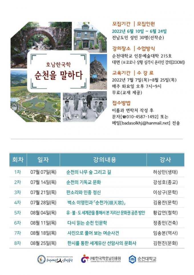 ¼øÃµ´ë Àι®Çмú¿øÀº (Àç)Çѱ¹ÇÐÈ£³²ÁøÈï¿øÀÇ È£³²Çѱ¹ÇРȰ¼ºÈ ¹× À§»ó Á¦°í¸¦ À§ÇÑ ¡®È£³²Çѱ¹ÇÐ °Á ¹× Çмú´ëȸ Áö¿ø °ø¸ð »ç¾÷¡¯¿¡ ¼±Á¤µÇ¾î, Àü³²µµ¹Î 30¸íÀ» ´ë»óÀ¸·Î ¡®È£³²Çѱ¹ÇÐ ¼øÃµÀ» ¸»ÇÏ´Ù¡¯ °ÀǸ¦ ¹«·á·Î Á¦°øÇÑ´Ù.