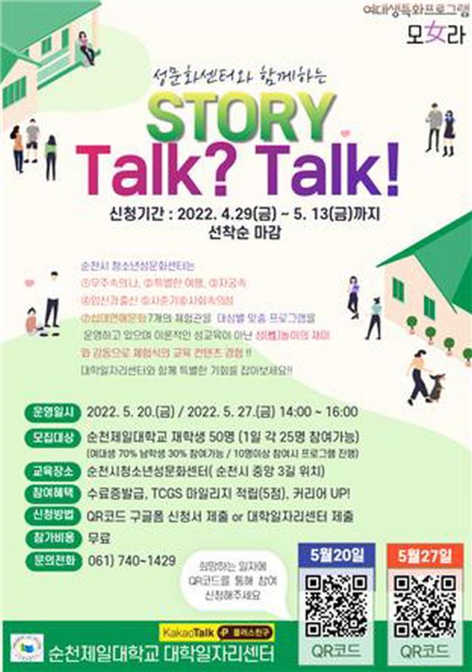 ¡¸STORY Talk? Talk!¡¹ ÇÁ·Î±×·¥Àº ¡âÀÚ±âÀÌÇØ¿Í ÀÇ»ç¼ÒÅë°ú ¸®´õ½Ê ¡â¼º(àõ)ÆòµîÇÑ ÀÇ»ç¼ÒÅë°ú ¸®´õ½Ê ÇÔ¾ç ¡â¾ç¼ºÆòµî ¹× Á¨´õÀÇ½Ä ÈÆ·Ã ¡â ¼øÃµ½Ãû¼Ò³â¼º¹®È¼¾ÅÍ Ã¼Çè°ü ¶ó¿îµùÀ» ÅëÇÑ ¿Ã¹Ù¸¥ ¼ºÁö½Ä ½Àµæ°ú °Ç°ÇÑ ¼º°¡Ä¡°üÀ» µµ¿ÍÁÖ´Â ¼º¹®È¼¾ÅÍ ÇÁ·Î±×·¥ ÀÌÇØ ¹× üÇèÀ» ÅëÇÑ À¯¾Æ, û¼Ò³â, ¼ºÀÎ µî ¿¬·É´ëº° ¼º±³À°¿¡ ´ëÇÑ ÀÌÇØ ÁõÁø ÇÁ·Î±×·¥À¸·Î ±¸¼ºµÇ¾ú´Ù