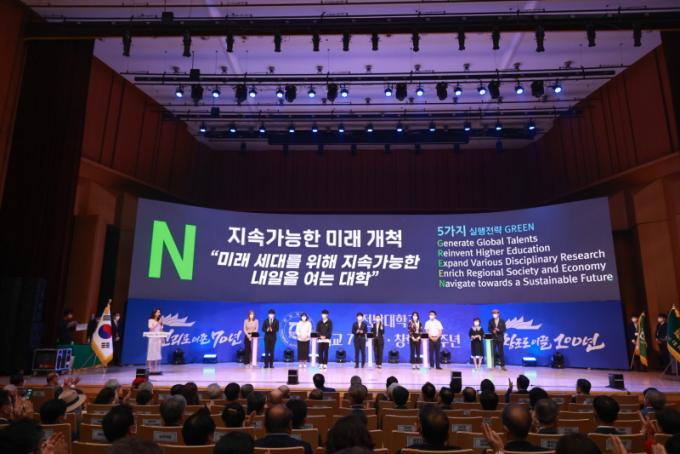 Á¤¼ºÅà ÃÑÀåÀº À̳¯ ±â³ä»ç¿¡¼ ¡°°í³°ú ¿µ±¤ÀÇ 70³â ¿ªÁ¤À» °É¾î ¿Â Àü³²´ëÇб³°¡ ÀÚ¶û½º·´°í, Àü³²´ë °¡Á· ¸ðµÎ¿¡°Ô °¨»ç¿Í ÃàÇϸ¦ µå¸°´Ù.¡±¸ç ¡°Àü³²´ëÇб³´Â Áö³ 70³â µ¿¾È Àü ¼¼°è¿Í Áö¿ª»çȸ °÷°÷¿¡ ±í°í ³ÐÀº »Ñ¸®¸¦ ³»·È±â¿¡, ¾ÕÀ¸·Î ¾î¶°ÇÑ À§±â¿Í ¾î·Á¿ò ¼Ó¿¡¼µµ ´õ ¾Æ¸§´Ù¿î ²É°ú °Ç½ÇÇÑ ¿¸Å¸¦ °ÅµÑ °Í¡±À̶ó°í ¸»Çß´Ù.