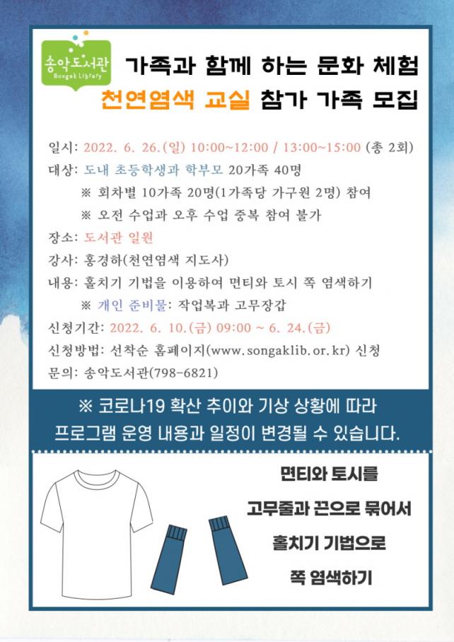 È«°æÇÏ(õ¿¬¿°»ö Áöµµ»ç) °»çÀÇ Áöµµ·Î Á÷¹°¿¡ »öÀ» ¹°µéÀ̴ õ¿¬¿°»ö °úÁ¤À» ÀÌÇØÇϰí, Á÷Á¢ ¸éƼ¿Í Åä½Ã¸¦ ¿°»öÇÏ´Â ½Ã°£À» °¡Áú ¿¹Á¤ÀÌ´Ù. º» °Á´ ÃʵîÇлý°ú Çкθð 20°¡Á·À» ´ë»óÀ¸·Î 6¿ù 26ÀÏ(ÀÏ) ¿ÀÀü 10½Ã¿Í ¿ÀÈÄ 1½Ã¿¡ ¿î¿µµÇ¸ç, 6¿ù 10ÀÏ(±Ý)ºÎÅÍ È¨ÆäÀÌÁö(www.songaklib.or.kr)¸¦ ÅëÇØ ¼±Âø¼øÀ¸·Î ½ÅûÇÒ ¼ö ÀÖ´Ù.