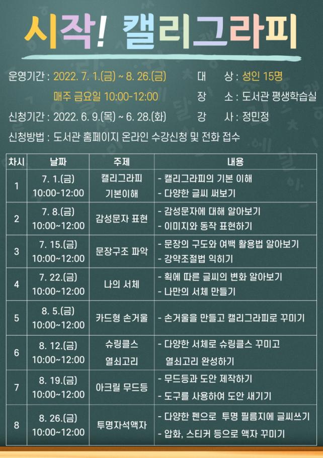 À̹ø ÇÁ·Î±×·¥Àº Á¤¹ÎÁ¤ °»çÀÇ Áöµµ·Î ¼ºÀÎ ´ë»óÀ¸·Î 2022³â 7¿ù 1ÀϺÎÅÍ 8¿ù 26ÀϱîÁö ¸ÅÁÖ ±Ý¿äÀÏ 10½ÃºÎÅÍ 12½Ã±îÁö ¿î¿µµÈ´Ù. ¸ÅÁÖ ´Ù¾çÇÑ Ä¶¸®±×¶óÇÇ ¼Ã¼¸¦ ¹è¿ì°í ÇнÀÇÑ ±Û¾¾¸¦ ÀÌ¿ëÇÏ¿© ÀÛǰÀ» ¸¸µé¾îº¸¸ç ¿¹¼úÀû °¨¼ö¼ºÀ» ÀÚ±ØÇÏ´Â »õ·Î¿î ¿©°¡ Ȱµ¿À» üÇèÇÏ°Ô µÈ´Ù. ¼ö° ½ÅûÀº 2022³â 6¿ù 9ÀÏ(¸ñ)ºÎÅÍ 6¿ù 28ÀÏ(È)±îÁö ¼±ÍÆ÷µµ¼°ü ȨÆäÀÌÁö(https://www.sgplib.or.kr/)¸¦ ÅëÇÑ ¿Â¶óÀÎ ¼ö° ½Åû, ¶Ç´Â ÀüÈ(¢Ï762-4307)·Î Á¢¼öÇÒ ¼ö ÀÖ´Ù.