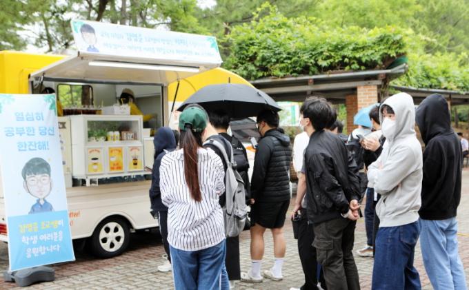 Àü³²´ë ¿©¼öÄ·ÆÛ½º ±è¿µÁØ ¾¾(±³Çбâȹ°ú Á¶±³)´Â 6¿ù 14ÀÏ Á¡½É½Ã°£À» ÀüÈÄÇØ 100¸¸¿ø »ó´çÀÇ Ä¿ÇǸ¦ ½ÇÀº Ä¿ÇÇ Æ®·°À» »çºñ·Î µ¿¿øÇØ, Çлýµé¿¡°Ô Ä¿ÇÇ ¼ö¹é ÀÜÀ» ¹«·á Á¦°øÇß´Ù. À̳¯ ³ë¶õ»ö Ä¿ÇÇ Æ®·°¿¡´Â ¡®¿©·¯ºÐÀÇ ±â¸»°í»ç¸¦ ÀÀ¿øÇÕ´Ï´Ù.¡¯¶ó°í ¾²ÀÎ Çö¼ö¸·±îÁö ³»°É¸ç ½ÃÇè°ú Ãë¾÷Áغñ¿¡ ÁöÄ£ ÇлýµéÀ» °Ý·ÁÇß´Ù.