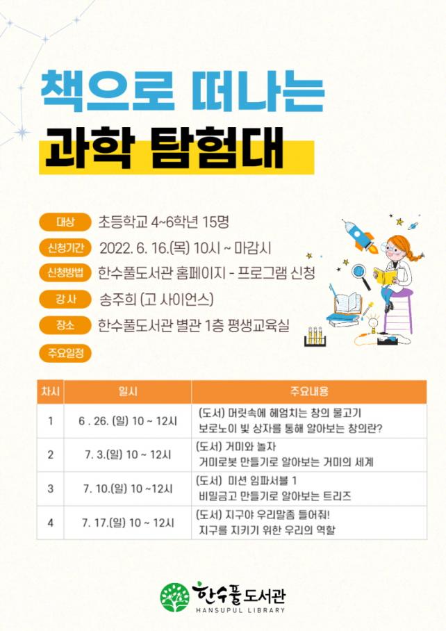 ÃʵîÇб³ 4~6Çгâ 15¸íÀ» ´ë»óÀ¸·Î ¼ÛÁÖÈñ(°í »çÀ̾ð½º) ¼±»ý´ÔÀÇ ÁöµµÇÏ¿¡ °úÇÐ °ü·Ã µµ¼¸¦ Ȱ¿ëÇÑ ¹®Á¦Çذá, ȯ°æº¸È£, âÀÛ ¸¸µé±â Ȱµ¿ µîÀ» ÁøÇàÇÒ ¿¹Á¤ÀÌ´Ù.