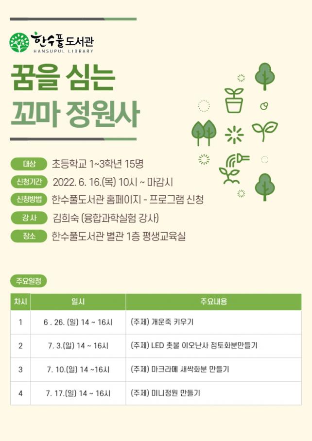 ÃʵîÇб³ 1~3Çгâ 15¸íÀ» ´ë»óÀ¸·Î ±èÈñ¼÷(À¶ÇÕ°úÇнÇÇè °»ç) ¼±»ý´ÔÀÇ ÁöµµÇÏ¿¡ ½Ä¹° ¾Ë¾Æº¸±â, ½Ä¹° ½É±â, Àڱ⸸ÀÇ ¹Ì´ÏÁ¤¿ø ²Ù¹Ì±â µî ´Ù¾çÇÑ È°µ¿À» ÁøÇàÇÒ ¿¹Á¤ÀÌ´Ù.