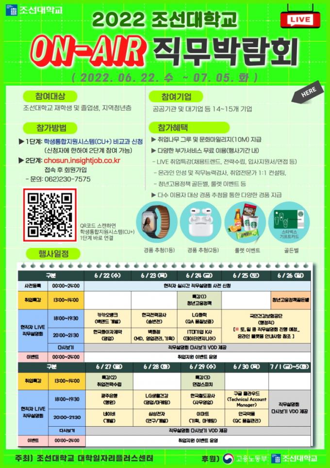 Á¶¼±´ëÇб³ ´ëÇÐÀÏÀÚ¸®Ç÷¯½º¼¾ÅͰ¡ Áö¿ª°ÅÁ¡´ëÇÐÀ¸·Î¼ Áö¿ª û³âÃþÀÇ Ãë¾÷ ¿ª·® °È¸¦ À§ÇÑ '2022 ON-AIR Á÷¹«¹Ú¶÷ȸ'¸¦ °³ÃÖÇÑ´Ù. À̹ø Á÷¹«¹Ú¶÷ȸ´Â ¿Â¶óÀÎ ¶óÀ̺ê·Î ÁøÇàµÅ Àå¼ÒÀÇ Á¦ÇÑ ¾øÀÌ ¾îµð¼µç Âü¿©ÇÒ ¼ö ÀÖ´Ù.