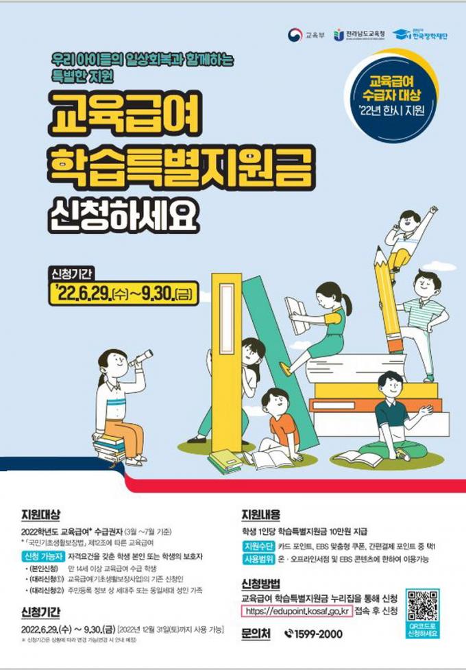Áö¿ø¹æ½ÄÀº ½Å¿ë(üũ)Ä«µå Æ÷ÀÎÆ®, EBS ¸ÂÃãÇü ÄíÆù, °£Æí°áÁ¦ Æ÷ÀÎÆ® Áß ¼±Åà °¡´ÉÇϸç, Áö¿ø±ÝÀº ÇнÀ°ÝÂ÷ ¿Ïȶó´Â ¸ñÀû¿¡ ¸Â°Ô ÇнÀÀ» À§ÇÑ ¿Â¤ý¿ÀÇÁ¶óÀÎ ¼Á¡ ¹× EBS ȨÆäÀÌÁö¿¡¼ 2022³â 12¿ù 31ÀϱîÁö »ç¿ë(¹Ì»ç¿ë ÀÜ¾× ÀÚµ¿ ¼Ò¸ê) ÇÒ ¼ö ÀÖ´Ù. Áö¿ø±ÝÀ» Áö¿ø¹Þ±â À§Çؼ´Â ±³À°±Þ¿© ¼ö±Þ Çлý º»ÀÎ(¸¸ 14¼¼ ÀÌ»ó)°ú Çкθð µî ´ë¸®ÀÎ(±³À°±Þ¿© ½ÅûÀÎ, Áֹεî·ÏÁ¤º¸»ó ¼¼´ëÁÖ¤ý¼ºÀÎ ¼¼´ë¿ø)ÀÌ 6¿ù 29ÀÏ(¼ö)ºÎÅÍ 9¿ù 30ÀÏ(±Ý) (¸ÅÀÏ 09:00~22:00)±îÁö ±³À°±Þ¿© ÇнÀƯº°Áö¿ø±Ý ½Åû ȨÆäÀÌÁö(https://edupoint.kosaf.go.kr)¿¡¼ ½ÅÃ»ÇØ¾ß ÇÑ´Ù.
