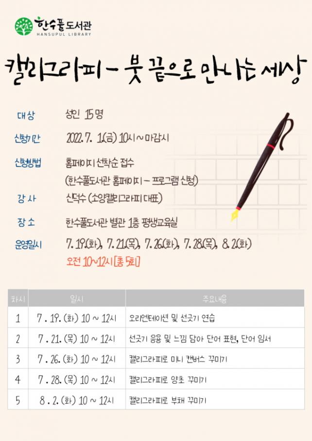 À̹ø ÇÁ·Î±×·¥Àº ¼ºÀÎ 15¸íÀ» ´ë»óÀ¸·Î ½Å´ö¼ö ͏®±×¶óÇÇ Àü¹®°»çÀÇ ÁöµµÇÏ¿¡ ͏®±×¶óÇÇ ±âÃÊ ÀÌ·Ð ¹× À̸¦ Ȱ¿ëÇÑ ´Ù¾çÇÑ ÀÛǰ ¸¸µé±â °úÁ¤À¸·Î ÁøÇàµÉ ¿¹Á¤ÀÌ´Ù. 7¿ù 1ÀÏ(±Ý) 10½ÃºÎÅÍ È¨ÆäÀÌÁö¸¦ ÅëÇØ Âü°¡ÀÚ ¸ðÁýÀ» ½ÃÀÛÇß°í, ¿À´Â 7¿ù 19ÀϺÎÅÍ 8¿ù 2ÀϱîÁö, ¸ÅÁÖ È¡¤¸ñ¿äÀÏ ¿ÀÀü 10½Ã¿¡ ÁøÇàµÇ¸ç 5ȸ °úÁ¤À¸·Î ¿î¿µµÈ´Ù.