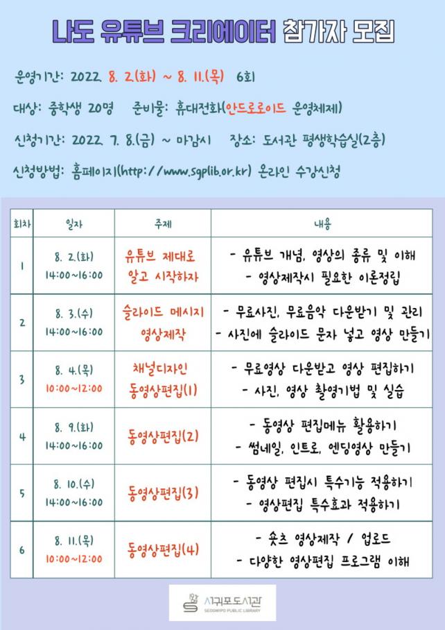 À̹ø ÇÁ·Î±×·¥À» ÅëÇØ À¯Æ©ºêÀÇ °³³ä, ¿µ»óÀÇ Á¾·ù, µ¿¿µ»ó ÆíÁý µî À¯Æ©ºê ÄÜÅÙÃ÷¸¦ Á¦ÀÛÇÏ´Â ¹æ¹ýÀ» ¹è¿öº»´Ù. º» ÇÁ·Î±×·¥Àº ¿©¿ø½Ä °»ç(Çѱ¹ ¹Ì·¡ºñÀü±³À°¿ø ´ëÇ¥)ÀÇ Áöµµ·Î ÁßÇлý 20¸íÀ» ´ë»óÀ¸·Î 8¿ù 2ÀÏ(È)ºÎÅÍ 8¿ù 11ÀÏ(¸ñ)±îÁö ÃÑ 6ȸ ¿î¿µµÈ´Ù.