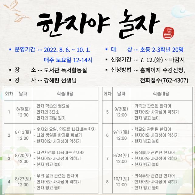 À̹ø ÇÁ·Î±×·¥Àº °Çý·Ã °»çÀÇ Áöµµ·Î Ãʵî 2~3Çг⠴ë»óÀ¸·Î 2022³â 8¿ù 6ÀϺÎÅÍ 10¿ù 1ÀϱîÁö ¸ÅÁÖ Åä¿äÀÏ 12½ÃºÎÅÍ 14½Ã±îÁö ¿î¿µµÈ´Ù. ¸ÅÁÖ ÁÖÁ¦º° ÇÑÀÚ¾î¿Í »çÀÚ¼º¾î¸¦ ¹è¿ì°í ÇнÀ ³»¿ëÀ» ¹ÙÅÁÀ¸·Î ³îÀÌ È°µ¿À» ÁøÇàÇÏ¿© ÀÍÈù ¾îÈÖ¸¦ ¹Ù·Î ÀÀ¿ëÇØº¸´Â ½Ã°£À» °®°Ô µÈ´Ù. ¼ö° ½ÅûÀº 2022³â 7¿ù 12ÀÏ(È)ºÎÅÍ 7¿ù 29ÀÏ(¸ñ)±îÁö ¼±ÍÆ÷µµ¼°ü ȨÆäÀÌÁö(https://www.sgplib.or.kr/)¸¦ ÅëÇÑ ¿Â¶óÀÎ ¼ö° ½Åû, ¶Ç´Â ÀüÈ(¢Ï762-4307)·Î Á¢¼öÇÒ ¼ö ÀÖ´Ù.