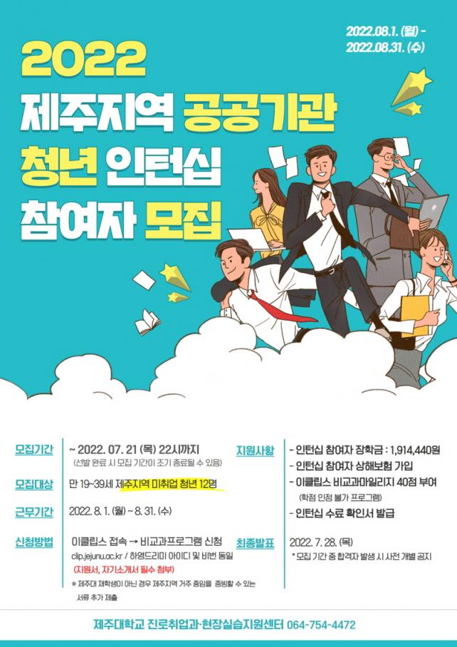 ÀÎÅÏ½Ê ±â°£Àº 8¿ù 1ÀϺÎÅÍ 31ÀϱîÁö¸ç, 6°³ °ø°ø±â°ü(Àç¿Üµ¿Æ÷Àç´Ü, Á¦ÁÖ°ü±¤°ø»ç, Á¦ÁÖ¹®È¿¹¼úÀç´Ü, Á¦ÁÖ¿¡³ÊÁö°ø»ç, Çѱ¹±¹Á¦±³·ùÁ¦´Ü, Çѱ¹Áö´ÉÁ¤º¸»çȸÁøÈï¿ø NIA ±Û·Î¹ú¼¾ÅÍ) ¾÷¹«¸¦ ¼öÇàÇÏ°Ô µÈ´Ù. Âü¿© ½ÅûÀº Á¦ÁÖ´ë ´ëÇÐÀÏÀÚ¸®Ç÷¯½º¼¾ÅÍ È¨ÆäÀÌÁö(https://jobcenter.jejunu.ac.kr)¸¦ ÅëÇØ¼ ÇÒ ¼ö ÀÖ´Ù.