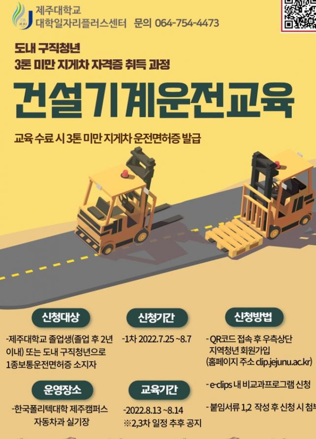 Á¦ÁÖÆ¯º°ÀÚÄ¡µµÀÇ Áö¿øÀ¸·Î ¿î¿µµÇ´Â °Ç¼³±â°è¿îÀü±³À° ÇÁ·Î±×·¥Àº Á¦ÁÖ´ë Á¹¾÷»ý(2³âÀ̳») ¶Ç´Â µµ³» ±¸Á÷ û³âµé¿¡°Ô ±³À°ºñ Àü¾×À» Áö¿øÇÏ°í±³À° °úÁ¤ ¼ö·á ½Ã 3Åæ ¹Ì¸¸ Áö°ÔÂ÷ ¿îÀü¸éÇãÁõÀ» ¹ß±ÞÇÑ´Ù.