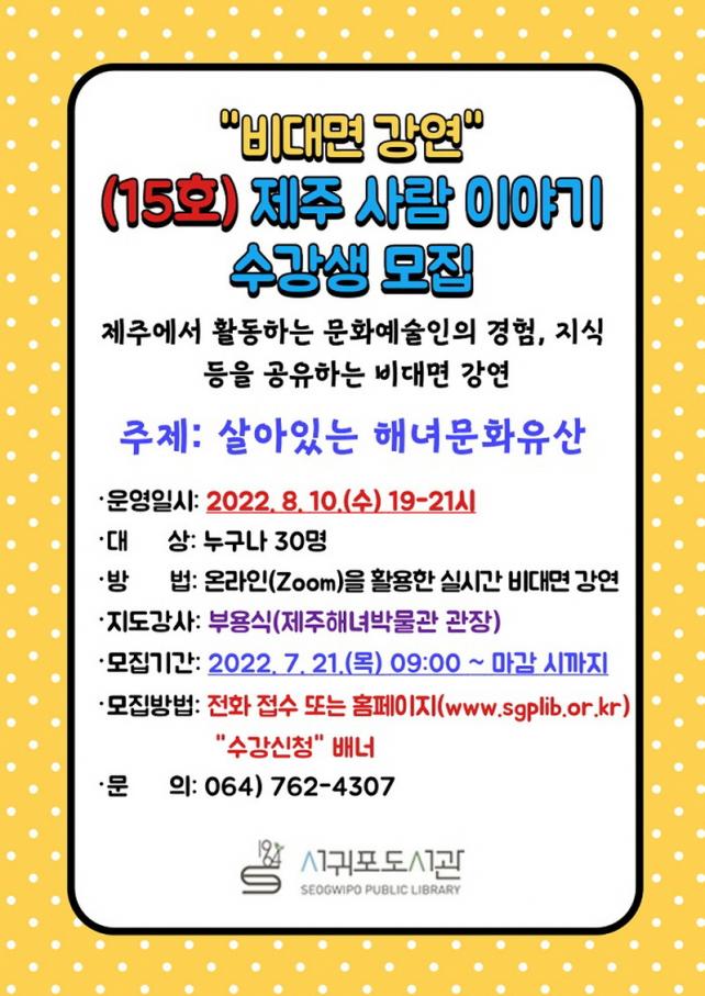 ºñ´ë¸é ¿Â¶óÀÎ(Zoom) ¹æ½ÄÀ¸·Î ÁøÇàµÇ´Â À̹ø °¿¬¿¡¼´Â ºÎ¿ë½Ä(Á¦ÁÖÇØ³à¹Ú¹°°ü °üÀå) °»ç´ÔÀ» ¸ð½Ã°í¡®»ì¾ÆÀÖ´Â ÇØ³à¹®ÈÀ¯»ê¡¯À̶ó´Â ÁÖÁ¦·Î ¿À´Â 8¿ù 10ÀÏ(¼ö) ¿ÀÈÄ 7~9½Ã¿¡ ¿î¿µµÈ´Ù.