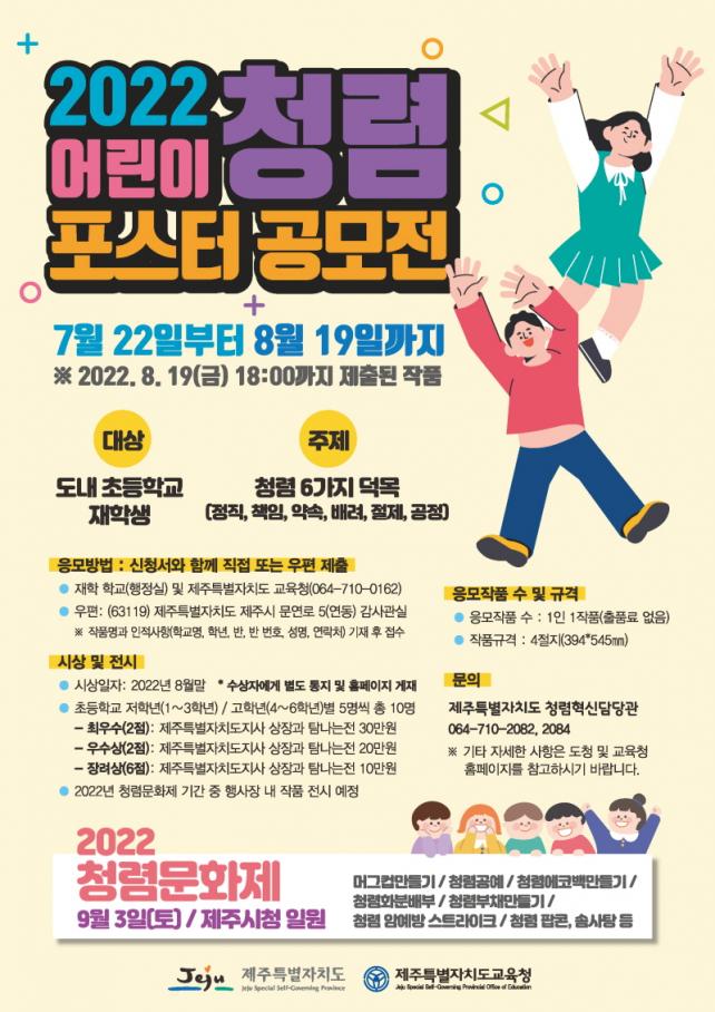 Á¦ÁÖµµ´Â ¸¼°í ±ú²ýÇÑ »çȸ¸¦ ¸¸µé±â À§ÇØ Ã»·Å 6°¡Áö ´ö¸ñ(Á¤Á÷, Ã¥ÀÓ, ¾à¼Ó, ¹è·Á, ÀýÁ¦, °øÁ¤)À» ¾î¸°À̺ÎÅÍ ½º½º·Î ½ÇõÇϰڴٴ ÀÇÁö¿Í ÁÖÀ§ÀÇ µ¿ÂüÀ» À̲ø¾î³¾ ¼ö ÀÖ´Â ³»¿ëÀ» ÁÖÁ¦·Î ¾î¸°À̵éÀÇ ´«³ôÀÌ¿¡ ¸Â´Â âÀÇÀûÀÎ Æ÷½ºÅ͸¦ °ø¸ðÇÑ´Ù. °ø¸ðÀü Âü°¡´Â µµ³» ÀçÇÐ ÁßÀÎ ÃʵîÇлýÀÌ¸é °¡´ÉÇϰí ÀÀ¸ðÀÛǰ°ú ½Åû¼¸¦ ÀçÇÐ ÁßÀÎ Çб³ ÇàÁ¤½Ç·Î Á¦ÃâÇϰųª µµ ±³À°Ã» °¨»ç°ü½Ç¿¡ ¿ìÆíÀ¸·Î Á¦ÃâÇÏ¸é µÈ´Ù.