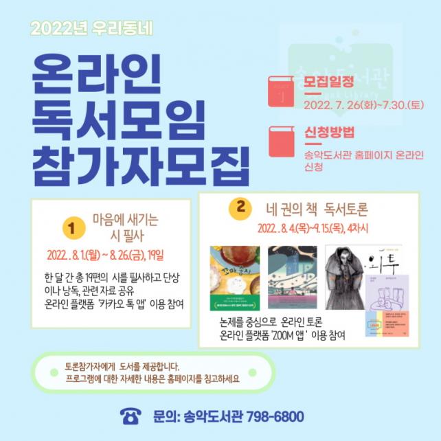 À̹ø ÇÁ·Î±×·¥Àº <³× ±ÇÀÇ Ã¥ µ¶¼Åä·Ð>, <¸¶À½¿¡ »õ±â´Â ½Ã ÇÊ»ç> µî µÎ °³ÀÇ ¼¼ºÎ °Á·ΠÁøÇàµÈ´Ù. Âü°¡ÀÚµéÀº Ã¥À» ÇÔ²² ÀÐ°í µ¶¼Åä·Ð°ú ÇÊ»ç µî ¿Â¶óÀÎ Ä¿¹Â´ÏƼ¸¦ ÅëÇØ µ¶¼¸ðÀÓ¿¡ Âü¿©ÇÒ ¼ö ÀÖ´Ù.