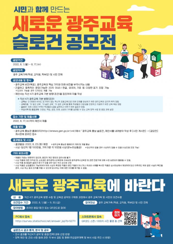 26ÀÏ ±¤Áֽñ³À°Ã»¿¡ µû¸£¸é Á÷¼± 4±â »õ·Î¿î ±¤ÁÖ±³À° ºñÀü°ú °¡Ä¡¸¦ Ç¥ÇöÇÒ ¼ö ÀÖ´Â Âü½ÅÇÑ ±¤ÁÖ±³À° ½½·Î°Ç °³¹ßÀ» À§ÇØ Çлý․Çкθð․±³Á÷¿ø ¹× ±¤ÁֽùÎÀ» ´ë»óÀ¸·Î °ø¸ðÀüÀ» ÃßÁøÇÑ´Ù. ƯÈ÷ À̹ø °ø¸ð¸¦ ÅëÇØ ±¤ÁÖ±³À° Ư»ö°ú Á¤Ã¼¼ºÀ» °¡Àå Àß µå·¯³»´Â ½½·Î°ÇÀ» ¼±Á¤ÇÏ°í ±¤ÁÖ±³À° Á¤Ã¥ È«º¸ µî¿¡ ³Î¸® Ȱ¿ëÇÒ °èȹÀÌ´Ù. °ø¸ð ±â°£Àº ¿À´Â 8¿ù1~17ÀÏÀ̸ç, ±¤ÁÖ±³À° È«º¸°ü ȨÆäÀÌÁö(http://enews.gen.go.kr/v4/)¸¦ ÅëÇØ ¿Â¶óÀÎÀ¸·Î Á¢¼öÇÏ¸é µÈ´Ù.