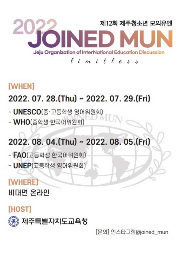 ¡¸Á¦12ȸ Á¦ÁÖû¼Ò³â ¸ðÀÇÀ¯¿£¡¹Àº ¼¼°èº¸°Ç±â±¸(WHO), À¯³×½ºÄÚ(UNESCO), À¯¿£½Ä·®³ó¾÷±â±¸(FAO), À¯¿£È¯°æ°èȹ(UNEP) µî ÃÑ 4°³ À§¿øÈ¸·Î ±¸¼ºµÆ´Ù. ±¹Á¦Çб³¸¦ Æ÷ÇÔÇÑ µµ³» 105¸íÀÇ Áß¡¤°íµîÇлýÀÌ ±¹Á¦±â±¸ À¯¿£(United Nations)ÀÇ ÀÇÀå´Ü, ÇÁ·¹½º, ½ºÅÂÇÁ, ´ë»ç´Ü µîÀÇ ¿ªÇÒÀ» ¼öÇàÇÏ¸ç ±¹Á¦»çȸÀÇ ÁÖ¿ä Çö¾È¿¡ ´ëÇÑ Çù»óÀ» ÅëÇØ À¯¿£ °áÀǾÈÀ» µµÃâÇϰí ÇÕ¸®ÀûÀÎ ÀÇ»ç°áÁ¤ ´É·ÂÀ» ¹è¾çÇϴ Ȱµ¿ÀÇ ±âȸ¸¦ Á¦°øÇÑ´Ù.