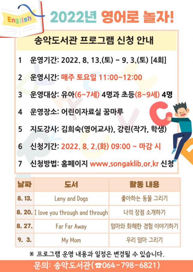 ±èÈñ¼÷(¿µ¾î±³»ç), °¸°(ÀÛ°¡, Çлý) °»çÀÇ Àç´É ±âºÎ·Î ¿î¿µµÇ¸ç, ±×¸²Ã¥À» ÇÔ²² ÀÐÀ¸¸ç Àç¹ÌÀÖ°Ô ¿µ¾î¸¦ ½ÀµæÇÏ´Â ½Ã°£À» °¡Áú ¿¹Á¤ÀÌ´Ù. º» °Á´ 6~9¼¼ ¾î¸°À̸¦ ´ë»óÀ¸·Î 8¿ù 13ÀϺÎÅÍ 9¿ù 3ÀϱîÁö ÃÑ 4ȸ¿¡ °ÉÃÄ ¸ÅÁÖ Åä¿äÀÏ 11½ÃºÎÅÍ 12½Ã±îÁö ¿î¿µµÇ¸ç, ȨÆäÀÌÁö(www.songaklib.or.kr)¸¦ ÅëÇØ ¼±Âø¼øÀ¸·Î ½ÅûÇÒ ¼ö ÀÖ´Ù.
