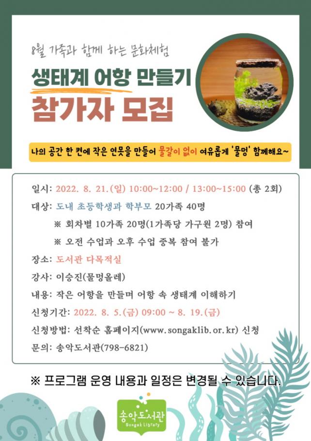 À̽ÂÁø(¹°¸Û¿Ã·¹) °»çÀÇ Áöµµ·Î ¼öÃʸ¦ ½ÉÀº ÀÛÀº ¾îÇ×À» ¸¸µé¾î º¸¸é¼ ¾îÇ× ¼Ó »ýŰ踦 ÀÌÇØÇÏ´Â ½Ã°£À» °¡Áú ¿¹Á¤ÀÌ´Ù. º» °Á´ ÃʵîÇлý°ú Çкθð 20°¡Á·À» ´ë»óÀ¸·Î 8¿ù 21ÀÏ(ÀÏ) 10½Ã¿Í 13½Ã¿¡ ¿î¿µµÇ¸ç, 8¿ù 5ÀÏ(±Ý)ºÎÅÍ È¨ÆäÀÌÁö(www.songaklib.or.kr)¸¦ ÅëÇØ ¼±Âø¼øÀ¸·Î ½ÅûÇÒ ¼ö ÀÖ´Ù.