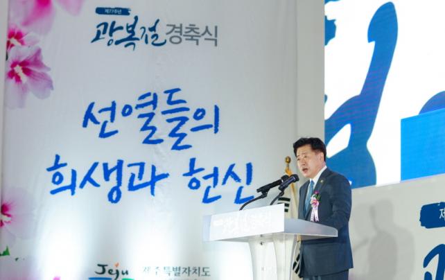 Á¦ÁÖÆ¯º°ÀÚÄ¡µµ´Â ±¤º¹À» À§ÇØ Çå½ÅÇÑ ¼ø±¹¼±¿°ú ¾Ö±¹Áö»çÀÇ ¼þ°íÇÑ ¶æÀ» ±â¸®±â À§ÇØ À̳¯ ¿ÀÀü 10½Ã Á¶ÃµÃ¼À°°ü¿¡¼ Á¦77Áֳ⠱¤º¹Àý °æÃà½ÄÀ» °ÅÇàÇß´Ù.
