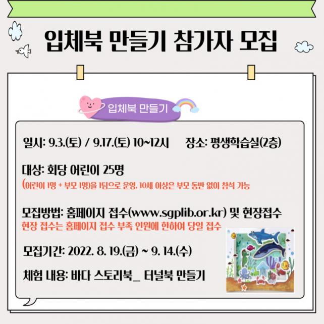 ÀÔüºÏ ¸¸µé±â üÇèÀº À̰æ¼÷ °»çÀÇ Áöµµ·Î ¾î¸°ÀÌ 25¸íÀ» ´ë»óÀ¸·Î 9¿ù 3ÀÏ, 17ÀÏ 2ȸ ÁøÇàµÇ¸ç, ¹Ù´Ùµ¿¹° ½º¹«°í°³ ÄûÁî, ÀÔüµ¿È ±¸¿¬, ¹Ù´Ù ½ºÅ丮ºÏ ¸¸µé±â¸¦ ÁøÇàÇÑ´Ù. ¼ö° ½ÅûÀº 2022³â 8¿ù 19ÀϺÎÅÍ ¼±ÍÆ÷µµ¼°ü ȨÆäÀÌÁö(https://www.sgplib.or.kr)¸¦ ÅëÇØ ½ÅûÇÒ ¼ö ÀÖ´Ù.