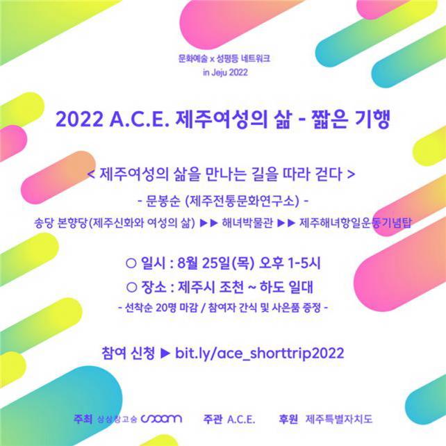»ó»óâ°í ¼û(´ëÇ¥ ¹ÚÁøÈñ)ÀÌ ÁÖÃÖÇϰí 2022 A.C.E. ±âȹÀ§¿øÈ¸(À§¿øÀå ¹ÚÁøÈñ)°¡ ÁÖ°üÇÏ´Â ¡®A.C.E. ¿¹¼úÁ¦¡¯´Â ¡¸¿òƲ¿òƲ ¼ºÆòµî ¸ðµÎ°¡ Æ·¿ò¡¹À̶ó´Â ÁÖÁ¦·Î ¡®Á¦ÁÖ¿©¼ºÀÇ »î-ªÀº±âÇ࡯, ¡®2022 A.C.E. Æ÷·³¡¯ ¹× ¡®2022 A.C.E. ¿¬´ë¸¶´ç¡¯ ÇÁ·Î±×·¥À¸·Î ±¸¼º¡¤¿î¿µµÈ´Ù.