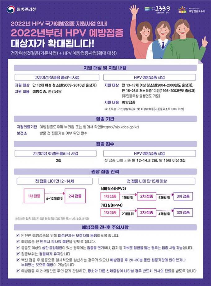 ´Ù¸¸ °¨¿° Àü Á¢Á¾ÀÌ ¸Å¿ì Áß¿äÇϹǷΠ°¨¿°ÀÇ ÁÖ¿ä ¿øÀÎÀÎ ¼º °æÇè ÀÌÀü¿¡ Á¢Á¾ÇÏ´Â °ÍÀÌ È¿°úÀûÀ̸ç, Á¢Á¾ ¿¬·É ¹× ¹é½Å Á¾·ù¿¡ µû¶ó Á¢Á¾ Ƚ¼ö¿Í °£°ÝÀÌ »óÀÌÇÏ´Ù. »ç¶÷À¯µÎÁ¾¹ÙÀÌ·¯½º(HPV) ±¹°¡¿¹¹æÁ¢Á¾ Áö¿ø ´ë»óÀº ±âÁ¸ ¸¸ 12¼¼ ¿©¼º û¼Ò³â¿¡¼ ¸¸12~17¼¼ ¿©¼º û¼Ò³â, ¸¸ 18~26¼¼ Àú¼ÒµæÃþ ¿©¼ºÀ¸·Î È®´ë(¡¯22.3.14.~)µÆÀ¸¸ç, HPV ±¹°¡¿¹¹æÁ¢Á¾ Áö¿ø ´ë»óÀÚ´Â °¡±î¿î ÁöÁ¤ÀÇ·á±â°ü (¶Ç´Â º¸°Ç¼Ò)¿¡¼ ¹«·á·Î ¿¹¹æÁ¢Á¾À» ¹ÞÀ» ¼ö ÀÖ´Ù. ÁöÁ¤ÀÇ·á±â°üÀº ¿¹¹æÁ¢Á¾µµ¿ì¹Ì ȨÆäÀÌÁö ¹× ½º¸¶Æ®Æù ¾Û¿¡¼ È®ÀÎ °¡´É ÇÑÆí, Àü¶óºÏµµ º¸°Ç´ç±¹Àº ¡°ÀڱðæºÎ¾Ï µîÀ» ¿¹¹æÇÏ´Â °¡Àå È¿°úÀûÀÎ ¹æ¹ýÀÎ HPV ¿¹¹æÁ¢Á¾ÀÇ Á߿伺À» °Á¶Çϸç, À̹ø ¿¬µµ ¸¶Áö¸· Áö¿ø ´ë»ó(¡¯04³â»ý, Àú¼ÒµæÃþÀº ¡¯95³â»ý±îÁö)ºÐµéÀº ¿ÃÇØ ¾È¿¡ ³õÄ¡Áö ¸»°í, 1Â÷ Á¢Á¾À» ¹ÞÀ» °Í¡±À» ´çºÎÇß´Ù.