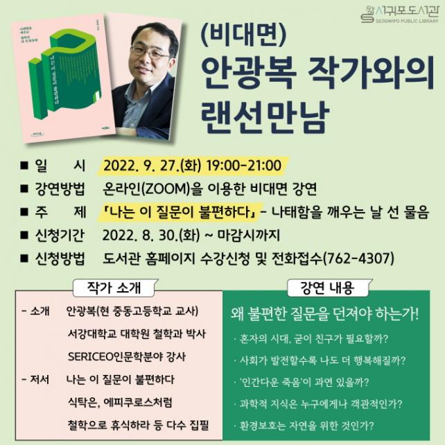 º» °¿¬Àº 2022³â 8¿ù 30ÀÏ(È)ºÎÅÍ ÀüÈ(¢Ï762-4307) ¶Ç´Â µµ¼°ü ȨÆäÀÌÁö(https://www.sgplib.or.kr/)¸¦ ÅëÇØ ¼±Âø¼ø 30¸í±îÁö ½ÅûÇÒ ¼ö ÀÖÀ¸¸ç, Áö¿ª ÁֹΠ´©±¸³ª Âü¿© °¡´ÉÇÏ´Ù.