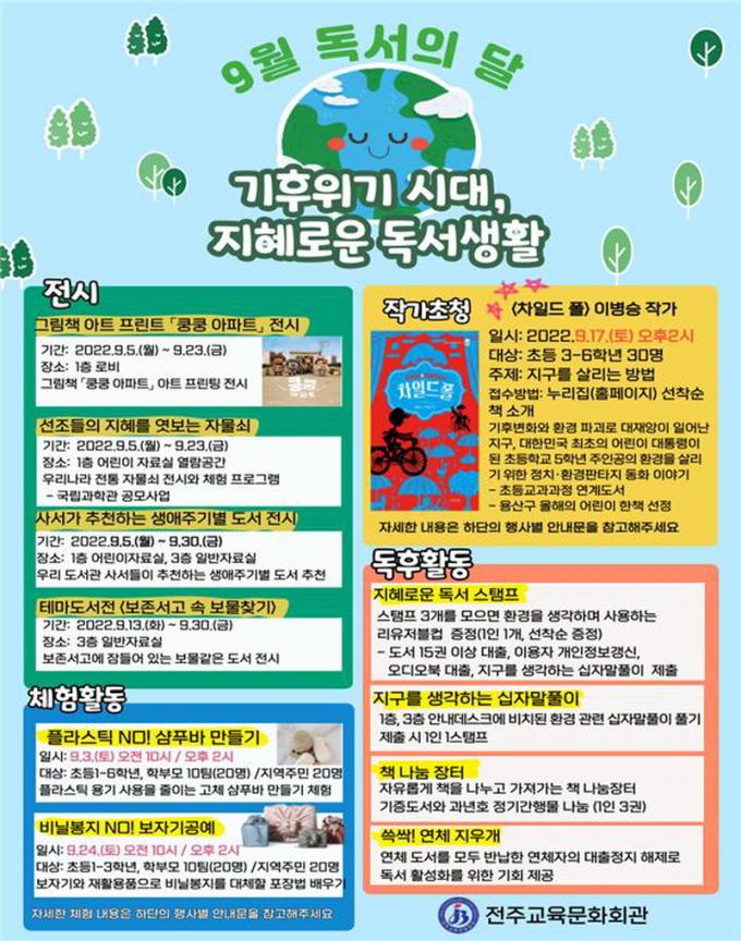 ¡¸9¿ù µ¶¼ÀÇ ´Þ¡¹¿¡ ´ëÇÑ ÀÚ¼¼ÇÑ ÀÏÁ¤ ¾È³»¿Í ½Åû ¹æ¹ýÀº ÀüÁÖ±³À°¹®Èȸ°ü ´©¸®Áý(lib.jbe.go.kr/jec)¿¡¼ È®ÀÎÇÒ ¼ö ÀÖÀ¸¸ç »çÀüÁ¢¼ö¸¦ ¹Þ°í ÀÖ´Ù. ±âŸ ÀÚ¼¼ÇÑ »çÇ×Àº µ¶¼±³À°°ú(¢Ï270-1693)·Î ¹®ÀÇÇÏ¸é µÈ´Ù.