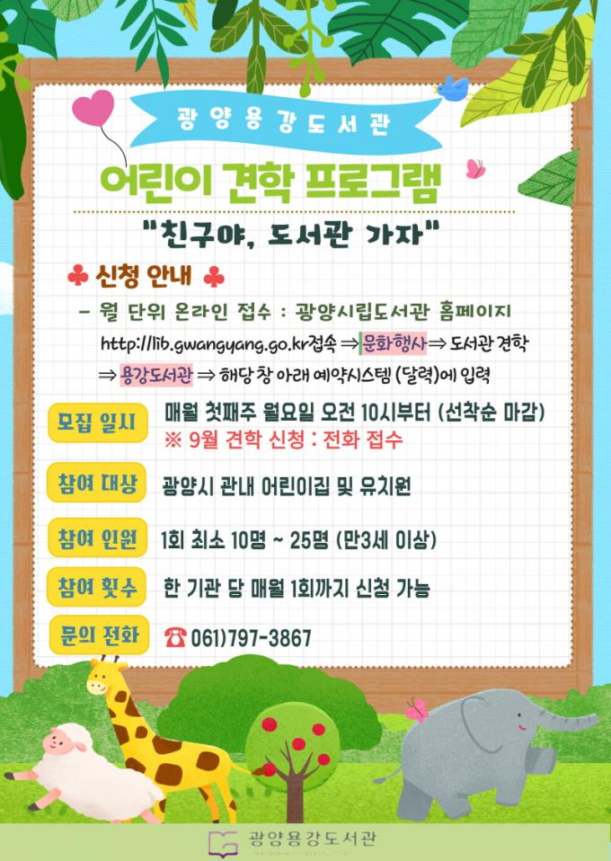 ÇØ´ç ÇÁ·Î±×·¥Àº Áö¿ª ³» ¾î¸°ÀÌÁý°ú À¯Ä¡¿øÀ» ´ë»óÀ¸·Î 9¿ù 13ÀÏ~12¿ù 19ÀÏ ¸ÅÁÖ 2ȸ(È, ¸ñ¿äÀÏ) ¿î¿µµÈ´Ù. Âü°¡¸¦ Èñ¸ÁÇÏ´Â ±â°üÀº ¸Å¿ù ù° ÁÖ ¿ù¿äÀϺÎÅÍ ±¤¾ç½Ã¸³µµ¼°ü ȨÆäÀÌÁö(lib.gwangyang.go.kr)¸¦ ÅëÇØ ½Åû °¡´ÉÇϰí, 9¿ù °ßÇнÅûÀº ÀüÈ·Î Á¢¼öÇÒ ¿¹Á¤ÀÌ´Ù.