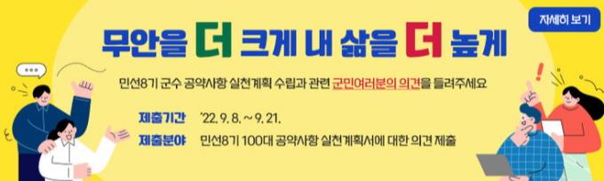 ¹«¾È±ºÀº °ø¾à ½Çõ°èȹ ¼ö¸³°ú °ü·ÃÇØ º¸´Ù Æø³ÐÀº ÀǰßÀ» ¹Ý¿µÇϰíÀÚ 9¿ù 21ÀϱîÁö 2ÁÖ°£ ±º ȨÆäÀÌÁö¸¦ ÅëÇØ ±º¹Î ÀǰßÀ» ¼ö·ÅÇÑ´Ù. ±º¹ÎÀÇ°ß ¼ö·Å °á°ú Á¦½ÃµÈ ÀǰßÀº ÇØ´ç ºÎ¼ÀÇ °ËÅ並 °ÅÃÄ Å¸´ç¼º°ú Çʿ伺ÀÌ ÀÎÁ¤µÉ °æ¿ì °ø¾à ½Çõ°èȹ¿¡ Àû±Ø ¹Ý¿µÇÒ °èȹÀÌ´Ù.