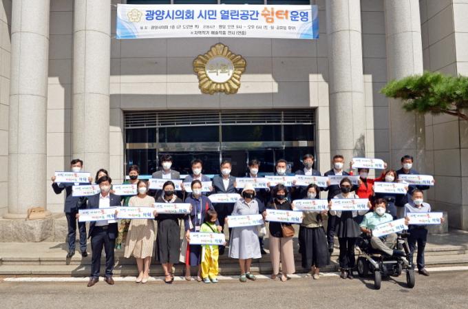 ÇÑÆí, ½Ã¹Î ¿¸° °ø°£Àº ¿ù¿äÀϺÎÅÍ ±Ý¿äÀÏ(09:00~18:00)±îÁö ¹«·á·Î ÀÌ¿ëÇÒ ¼ö ÀÖ°í, ½Åû ¹æ¹ýÀ̳ª ±Ã±ÝÇÑ »çÇ×Àº ±¤¾ç½Ã ÀÇȸ»ç¹«±¹ ¢Ï 061) 797-2514, 2896, ±¤¾ç½ÃÀÇȸ ȨÆäÀÌÁö(https://council.gwangyang.go.kr)¸¦ È®ÀÎÇÏ¸é µÈ´Ù.