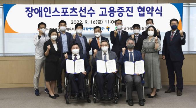 Àü³²´ë´Â 9¿ù 16ÀÏ ¿ÀÀü 11½Ã ±¤ÁÖ½ÃÀå¾ÖÀÎüÀ°È¸ ÁßȸÀǽǿ¡¼ Çѱ¹Àå¾ÖÀΰí¿ë°ø´Ü, ±¤ÁÖ½ÃÀå¾ÖÀÎüÀ°È¸¿Í ÇÔ²² Àå¾ÖÀÎ ½ºÆ÷Ã÷¼±¼ö °í¿ëÁõÁøÀ» À§ÇÑ Çù¾àÀ» ü°áÇß´Ù.