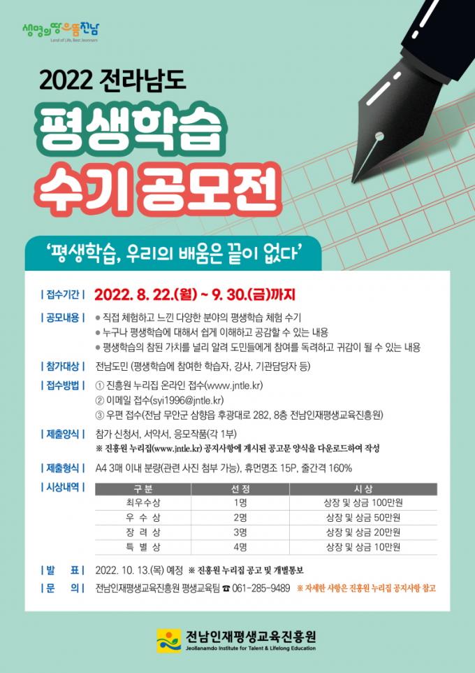 À̹ø °ø¸ðÀüÀº Æò»ýÇнÀ¿¡ Âü¿©ÇÑ Àü³²µµ¹ÎÀ̶ó¸é ´©±¸³ª Âü°¡ÇÒ ¼ö ÀÖ´Ù. Á¢¼ö´Â 9¿ù 30ÀϱîÁö·Î ÀÎÆò¿ø ´©¸®Áý(www.jntle.kr)°ú À̸ÞÀÏ ¶Ç´Â ¿ìÆíÀ¸·Î ÇÏ¸é µÈ´Ù.