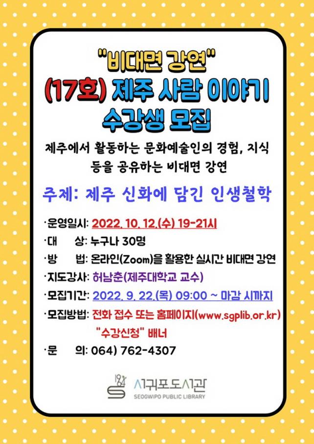 ºñ´ë¸é ¿Â¶óÀÎ(Zoom) ¹æ½ÄÀ¸·Î ÁøÇàµÇ´Â À̹ø °¿¬¿¡¼´Â Çã³²Ãá(Á¦ÁÖ´ëÇб³ ±³¼ö) °»ç´ÔÀ» ¸ð½Ã°í¡®Á¦ÁÖ ½ÅÈ¿¡ ´ã±ä ÀλýöÇС¯À» ÁÖÁ¦·Î ¿À´Â 10¿ù 12ÀÏ ¿ÀÈÄ 7~9½Ã¿¡ ¿î¿µµÈ´Ù.
