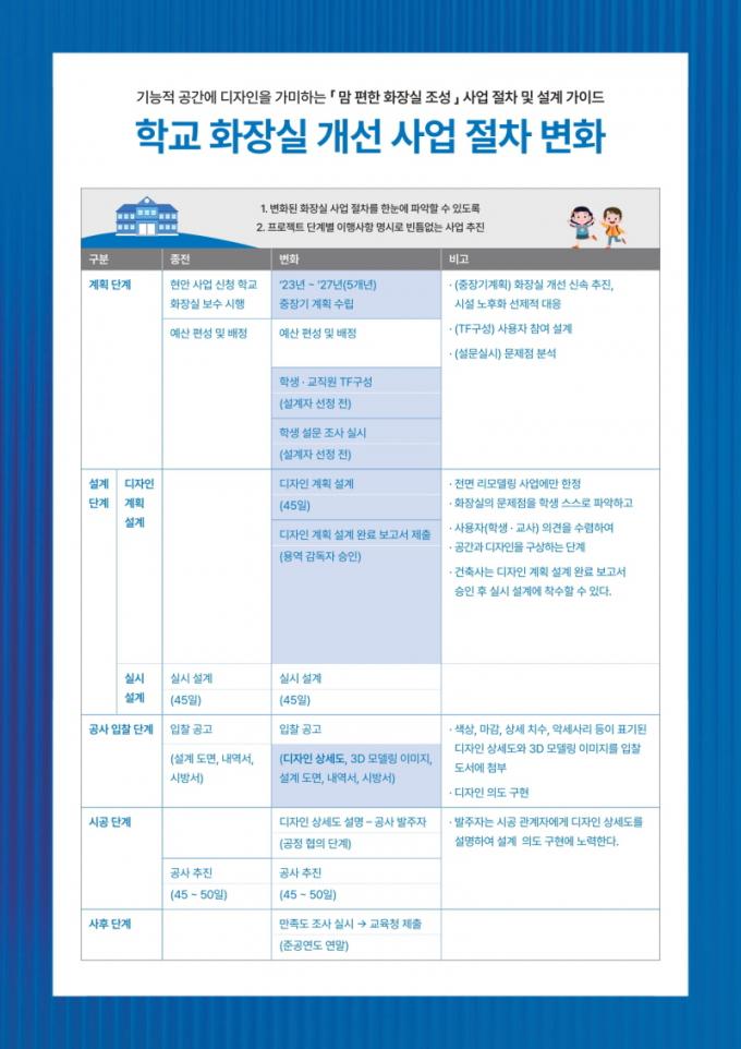 °¡À̵å´Â Å©°Ô ¡®»ç¾÷ÀýÂ÷ °¡À̵塯¿Í ¡®¼³°è °¡À̵塯·Î ±¸ºÐÇØ ´Ü°èº° ¼¼¼¼ÇÑ ¼³¸í°ú ¿¹½Ã¸¦ ´ã¾Ò´Ù. ƯÈ÷ ¡®»ç¾÷ÀýÂ÷ °¡À̵塯¿¡´Â °ÇÃà»ç, Çлý, ±³Á÷¿øÀÌ ÇÔ²²ÇÏ´Â µðÀÚÀΰèȹ ÀýÂ÷¸¦ ½Å¼³ÇØ ÈÀå½Ç °ø°£±¸¼º°ú µðÀÚÀÎ ¹æÇâ¿¡ ´ëÇØ »ç¿ëÀÚ ÀǰßÀÌ Àû±Ø ¹Ý¿µµÇµµ·Ï Çß´Ù.