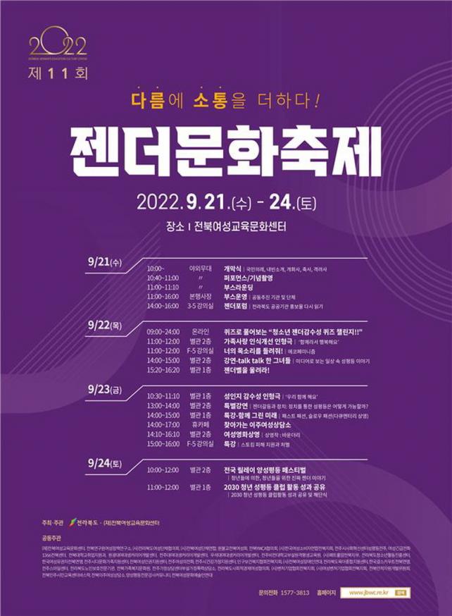 ¾Æ¿ï·¯, À̹ø Çà»ç´Â 9¿ù 21ÀÏ(¼ö)ºÎÅÍ 24ÀÏ(Åä)±îÁö 4Àϰ£ ÀüºÏ¿©¼º±³À°¹®È¼¾ÅÍ ÀÏ¿ø¿¡¼ Á¨´õ°¨¼ö¼º ÄûÁî 縰Áö, °¡Á·»ç¶û Àνݳ¼± ÀÎÇü±Ø, °¿¬, Á¨´õº§À» ¿ï·Á¶ó! ¼ºÀÎÁö °¨¼ö¼º ÀÎÇü±Ø , ´ÙÅ¥¸àÅ͸® »ó¿µ, Àü±¹ ¸±·¹ÀÌ ¾ç¼ºÆòµî Æä½ºÆ¼¹ú µî ´Ùä·Î¿î ÇÁ·Î±×·¥À¸·Î ÆîÃÄÁú ¿¹Á¤ÀÌ´Ù.
