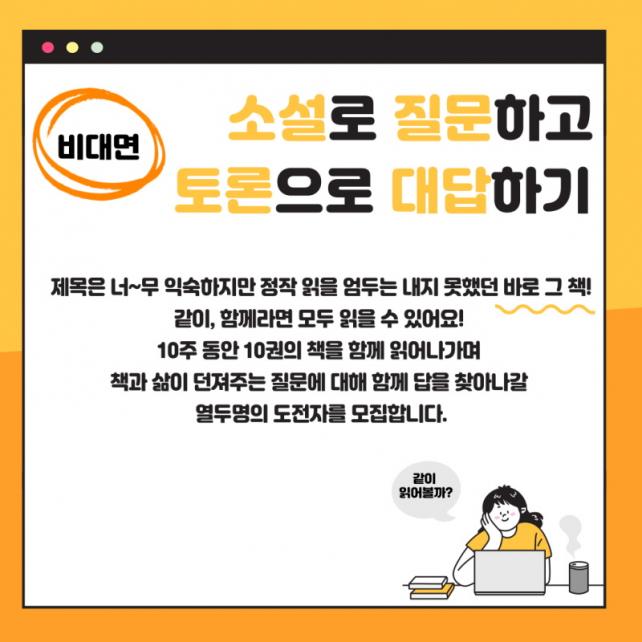 º» °Á´ ¸ÅÁÖ ¸ñ¿äÀÏ 19½Ã 30ºÐºÎÅÍ 21½Ã 30ºÐ±îÁö ÁÜ(ZOOM) ÇÁ·Î±×·¥À» ÀÌ¿ëÇÏ¿© ºñ´ë¸éÀ¸·Î ¿î¿µµÇ¸ç Âü°¡½ÅûÀº Á¦³²µµ¼°ü ȨÆäÀÌÁö(www.jnlib.go.kr) »ó´Ü [µµ¼°üÇÁ·Î±×·¥] - [¼ö°½Åû] ¸Þ´º¿¡¼ ¼±Âø¼øÀ¸·Î ¸ðÁýÇÑ´Ù. Åä·Ð µµ¼ ¹× ÀÏÁ¤Àº µµ¼°ü ȨÆäÀÌÁö °øÁö »çÇ׿¡¼ È®ÀÎ °¡´ÉÇÏ¸ç ±âŸ ÀÚ¼¼ÇÑ »çÇ×Àº ÀüÈ(¢Ï766-4620)·Î ¹®ÀÇÇÏ¸é µÈ´Ù.