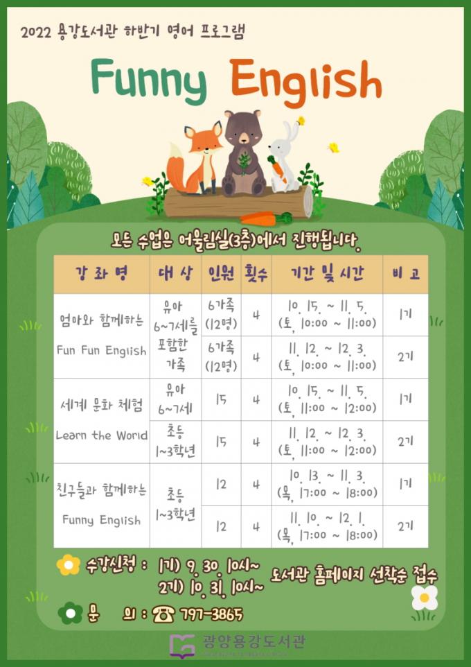 ÇÁ·Î±×·¥ °úÁ¤Àº ¡ãÀ¯¾Æ(6~7¼¼)¸¦ ´ë»óÀ¸·Î ºÎ¸ð¿Í ÇÔ²² ¿µ¾î·Î ÇÏ´Â º¸µå°ÔÀÓ ¡®Fun Fun English¡¯ ¡ãÃʵî 1~3ÇгâÀ» ´ë»óÀ¸·Î Ä£±¸µé°ú ÇÔ²² Áñ±â¸ç ¿µ¾î µè±â¿Í ȸȷΠÁøÇàµÇ´Â ¡®Funny English¡¯ ¡ãÀ¯¾Æ ¹× Ãʵî 1~3Çг⠰³º° ÇÁ·Î±×·¥À¸·Î ¼¼°è ¹®È¸¦ ¹è¿ö°¡´Â ¡®Learn the World¡¯·Î ±¸¼ºÇß´Ù.