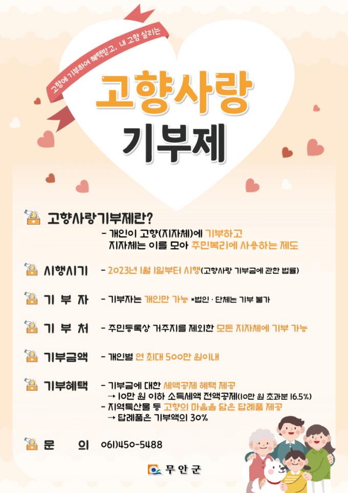 ¹«¾È±º(±º¼ö ±è»ê)ÀÌ 2023³â 1¿ù ½ÃÇàµÇ´Â °íÇâ»ç¶û±âºÎÁ¦ÀÇ ¼º°øÀûÀÎ Á¤ÂøÀ» À§ÇØ Á¦µµ ¾Ë¸®±â¿Í »çÀüÁغñ¿¡ ¹ÚÂ÷¸¦ °¡Çϰí ÀÖ´Ù. 26ÀÏ ¹«¾È±º¿¡ µû¸£¸é °³ÀÎÀÌ Å¸ ÁöÀÚü¿¡ ¿¬°£ 500¸¸¿ø±îÁö ±âºÎÇÒ ¼ö ÀÖ´Â °íÇâ»ç¶û±âºÎÁ¦´Â ±âºÎ¾× 10¸¸¿ø±îÁö´Â Àü¾×, ÃʰúºÐÀº 16.5% ¼¼¾×°øÁ¦ ÇØÅðú ÇÔ²² 30% À̳»ÀÇ ´ä·ÊǰÀ» ¹ÞÀ» ¼ö ÀÖ´Â Á¦µµÀÌ´Ù.