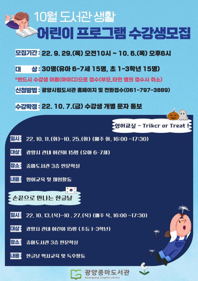 10¿ù µµ¼°ü »ýȰ ¾î¸°ÀÌ ÇÁ·Î±×·¥ ¼ö° ½Åû°ú ´Ù¸¥ ±Ã±ÝÇÑ »çÇ×Àº ±¤¾ç½Ã¸³µµ¼°ü ȨÆäÀÌÁö¸¦ ¹æ¹®Çϰųª ±¤¾çÁ߸¶µµ¼°ü(¢Ï061-797-3889)À¸·Î ¹®ÀÇÇϸé ÀÚ¼¼È÷ ¾Ë ¼ö ÀÖ´Ù.