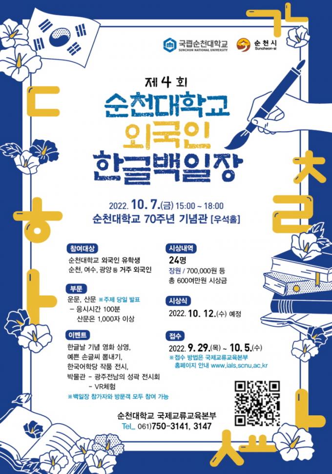 ¿Ü±¹ÀÎ Çѱ۹éÀÏÀåÀº ¼øÃµ ¹× ¿©¼ö, ±¤¾ç µî Áö¿ª»çȸ¿¡ °ÅÁÖÇϰí ÀÖ´Â ¿Ü±¹Àο¡°Ô ¿Ã¹Ù¸¥ ¿ì¸®¸»À» ±ÇÀåÇϰí ÇѱÛÀÇ ¿ì¼ö¼º°ú ¾Æ¸§´Ù¿òÀ» ³Î¸® ¾Ë¸®±â À§ÇÑ ÃëÁö·Î ¼øÃµ½Ã Áö¿øÀ¸·Î ¸Å³â ¿¸®°í ÀÖ´Ù.
