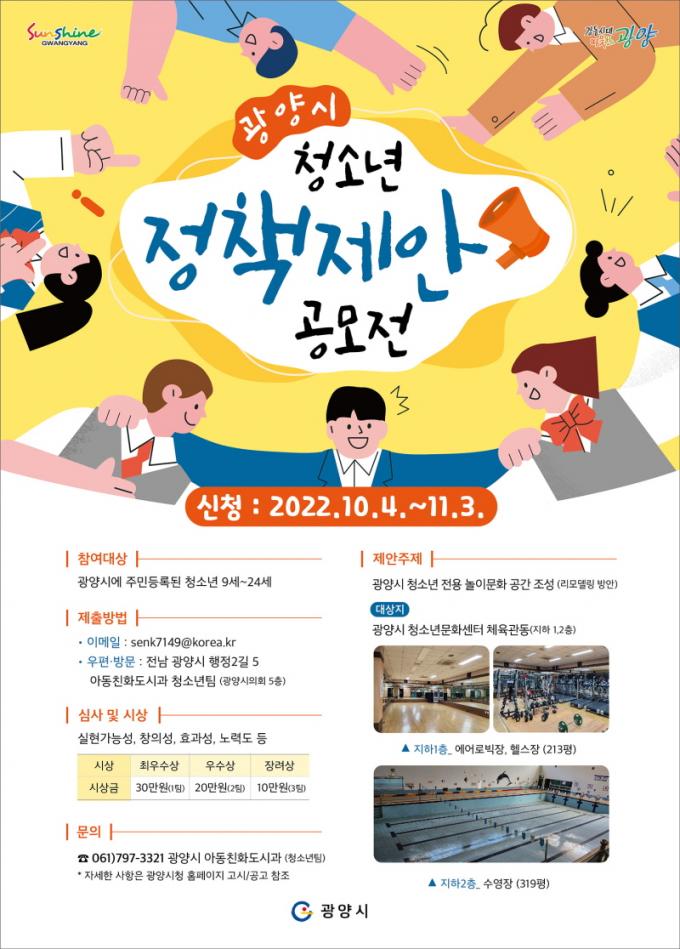 Âü¿©´ë»óÀº ±¤¾ç½Ã¿¡ °ÅÁÖÇÏ´Â 9~24¼¼ û¼Ò³âÀ̸ç, Á¢¼ö±â°£Àº ¿À´Â 11¿ù 3ÀϱîÁö·Î °ø¸ðÀü ÁÖÁ¦´Â ¡®±¤¾ç½Ã û¼Ò³â Àü¿ë ³îÀ̹®È°ø°£ Á¶¼º ¸®¸ðµ¨¸µ ¹æ¾È¡¯ÀÌ´Ù. ´ë»óÁö´Â ±¤¾ç½Ãû¼Ò³â¹®È¼¾ÅÍ Ã¼À°°üµ¿ ÁöÇÏ 1¡¤2Ãþ °ø°£À¸·Î, ÇöÀç ¿¡¾î·ÎºòÀå, ÇコÀå, ¼ö¿µÀåÀ¸·Î »ç¿ëÇÏ´ø °ø°£À» û¼Ò³âÀÇ ½°¡¤³îÀÌ¡¤¹®È°ø°£À¸·Î Ȱ¿ëÇÒ ¹æ¾ÈÀ» Á¦¾ÈÇÏ¸é µÈ´Ù.