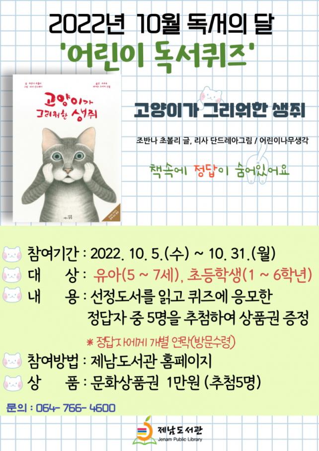 À̹ø 2022³â 10¿ù ¾î¸°ÀÌ µ¶¼ÄûÁî Çà»ç´Â Á¦³²µµ¼°ü ȨÆäÀÌÁö °øÁö»çÇ׿¡¼ ÀÀ¸ð °¡´ÉÇÏ´Ù. 10¿ù ¾î¸°ÀÌ µ¶¼ÄûÁî ¼±Á¤ Ã¥Àº¡º°í¾çÀ̰¡ ±×¸®¿öÇÑ »ýÁã¡»(Á¶¹Ý³ª Ãʺ¼¸® ±Û․ ¸®»ç ´Üµå·¹¾Æ ±×¸², ¾î¸°À̳ª¹«»ý°¢ ÃâÆÇ»ç)ÀÌ´Ù.