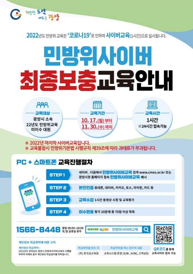 ±³À°´ë»óÀÚ´Â PC³ª ½º¸¶Æ®ÆùÀ» ÅëÇØ ¹Î¹æÀ§ »çÀ̹ö±³À° ȨÆäÀÌÁö(www.cmes.or.kr)¿¡ Á¢¼ÓÇØ 1½Ã°£°¡·® ¸ðµç ±³À°°úÁ¤À» ¼ö° ÈÄ °´°ü½Ä 20°³ ¹®Ç× Áß 14°³ ÀÌ»ó ¸ÂÃç¾ß ±³À°À» À̼öÇÒ ¼ö ÀÖ´Ù.