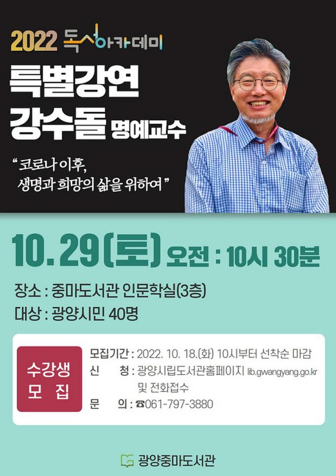 °¿¬¿¡ Âü¿©¸¦ ¿øÇÏ´Â ½Ã¹ÎÀº 10¿ù 18ÀϺÎÅÍ ±¤¾ç½Ã¸³µµ¼°ü ȨÆäÀÌÁö(lib.gwangyang.go.kr)¿Í ÀüÈ(¢Ï061-797-3880)·Î ½ÅûÇÒ ¼ö ÀÖ´Ù.