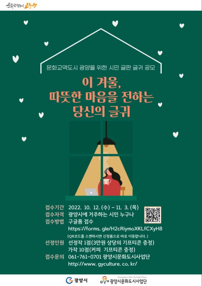 °ø¸ð ÁÖÁ¦´Â ¡®ÀÌ °Ü¿ï, µû¶æÇÑ ¸¶À½À» ÀüÇÏ´Â ±Û±Í¡¯·Î 30ÀÚ À̳» ±ÛÀ̶ó¸é ±¤¾ç½Ã¹Î ´©±¸³ª ±¸±ÛÆû(https://forms.gle/H2cRiymoXKLfCXyH8)À¸·Î ÀÚÀ¯·Ó°Ô Âü¿©ÇÒ ¼ö ÀÖ´Ù. ´Ù¸¸ ÀúÀÛ±Ç ¶Ç´Â ¹ý¿¡ ÀúÃ˵Ǵ ±Û, Àüü ¶Ç´Â ÀϺΰ¡ ÀÌ¹Ì À¯Æ÷µÈ ±Û, ±¤°í¡¤»ó¾÷¼º ±Û µîÀº ½É»ç´ë»ó¿¡¼ Á¦¿ÜµÈ´Ù.